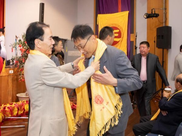 李国兴会长为刘东主任佩戴黄丝巾 凌永雄摄影