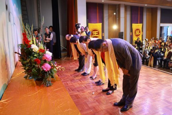 第四项仪程:恭拜始祖。黄帝像高悬于舞台正中,神圣端庄。来宾们躬身下拜,齐行三鞠躬礼。