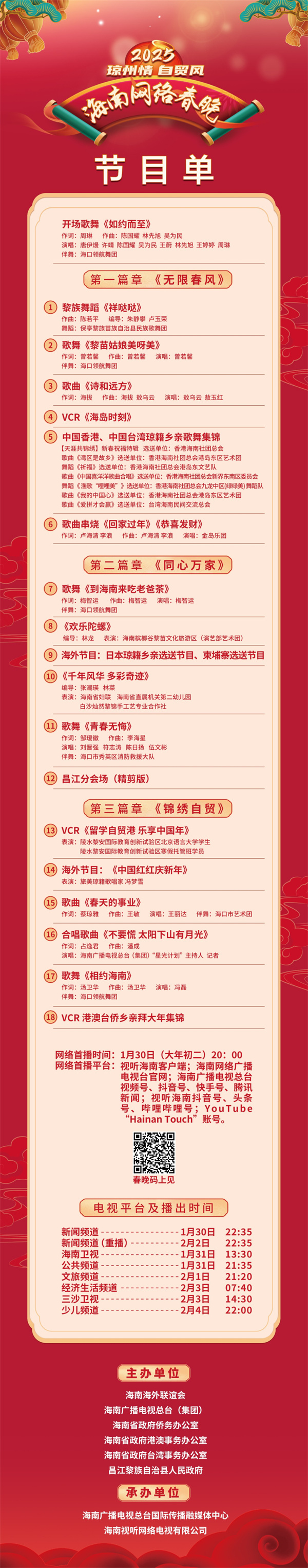 据悉,本届网络春晚还将在海南广播电视总台旗下各频道轮番播出,1月30日22:35新闻频道、1月31日13:30海南卫视、1月31日21:35公共频道、2月1日21:20文旅频道、2月2日22:35新闻频道重播、2月3日07:40经济生活频道、2月3日14:30三沙卫视、2月4日22:00少儿频道,敬请期待!