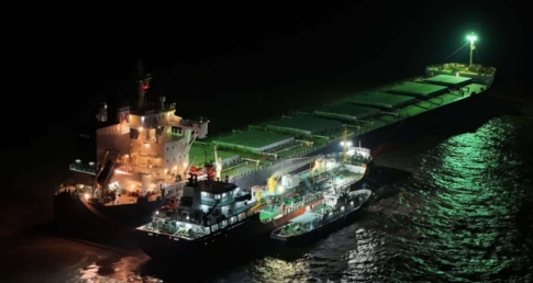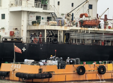 中午时分,在国际虾峙门中国(普陀)航运服务产业园码头,海事服务锚地供应船——“舟泊通8”轮装载着船舶备件、生活用品等近7吨物资,出发前往舟山虾峙门北锚地。大约一小时后,并靠到完成加油业务的巴哈马籍“非洲黄鹂”轮,外籍船员用船上吊机把一箱箱物资装上船。