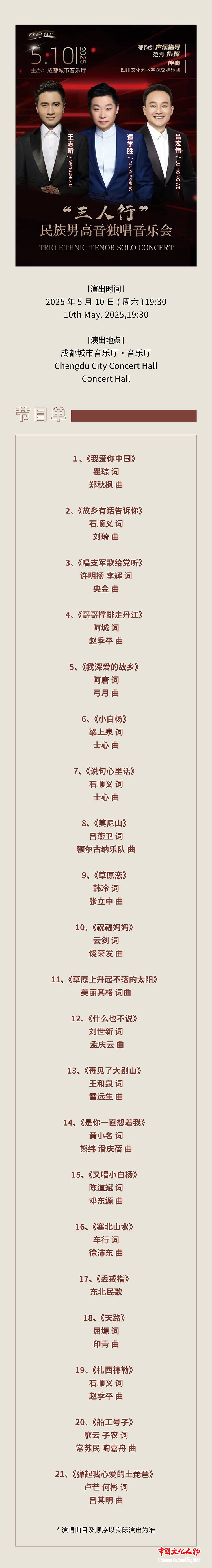 “三人行”民族男高音独唱音乐会于5月10日19:30在成都城市音乐厅唱响,中国文化人物网、中国名家新闻网、文化人物网等主流媒体平台向海内外全程同步直播