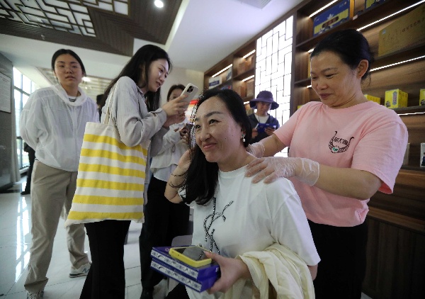 游客在兴文县苗医体验馆体验按摩。 王磊 摄