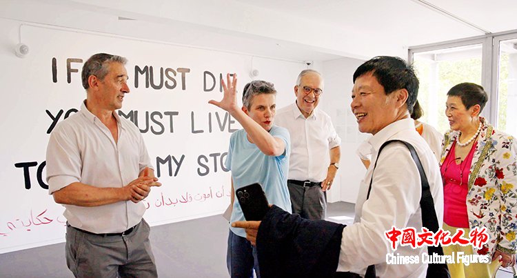 巴黎国际艺术城委员会主任本尼迪克特・阿利奥特为中国美术家协会副主席祁海峰、长江(中国)发展股份有限公司董事长张青等介绍在巴黎国际艺术城研修的艺术家的展览,并参观了巴黎国际艺术城60周年(1965年至2025年)历程回顾展