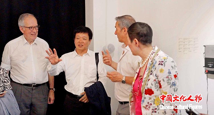 长江(中国)发展股份有限公司董事长张青与艺术家在展览作品前交流