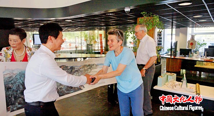 中国美术家协会副主席祁海峰向巴黎国际艺术城捐赠自己创作的中国画《太行春色》