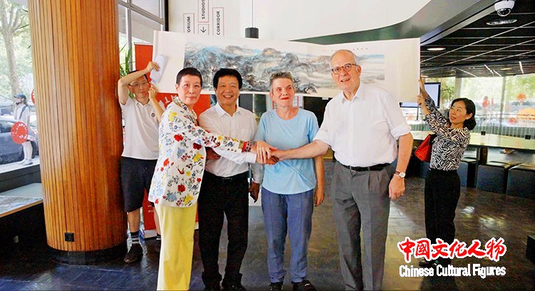 中国美术家协会副主席祁海峰、长江(中国)发展股份有限公司董事长张青与巴黎国际艺术城委员会主席顾山、主任本尼迪克特・阿利奥特在捐赠作品前合影留念