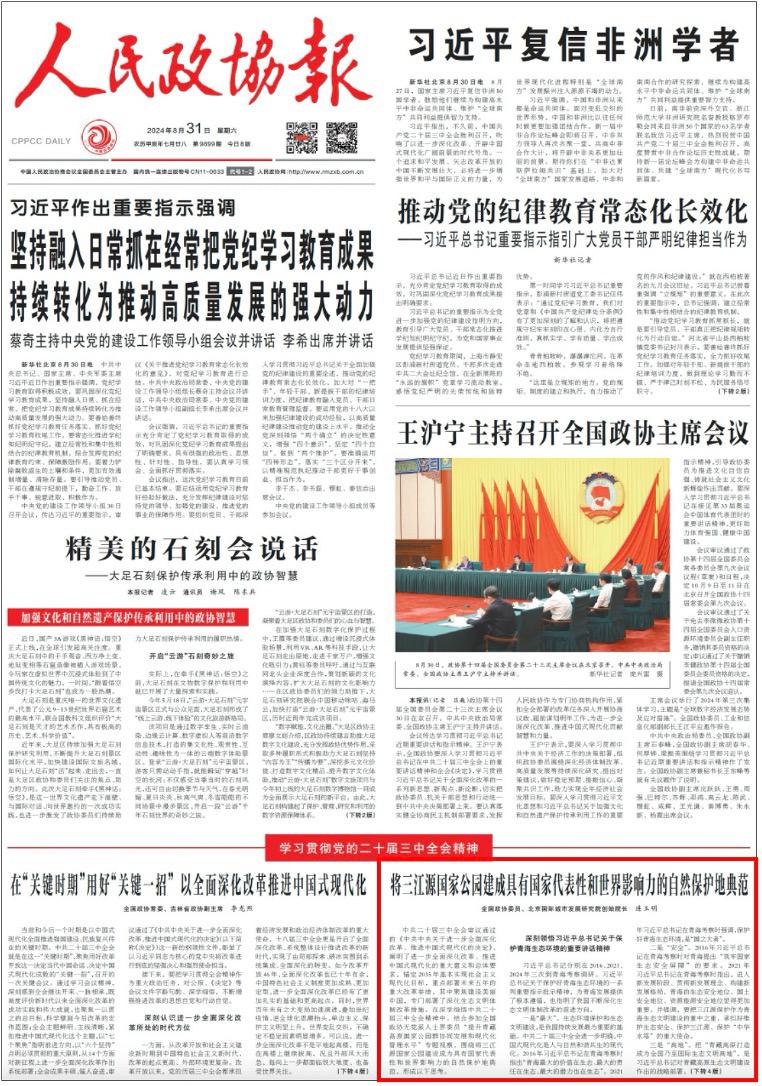 2024年8月31日,连玉明院长在《人民政协报》头版发表署名文章《将三江源国家公园建成具有国家代表性和世界影响力的自然保护地典范》,结合参加全国政协赴青海专题视察和专题调研,提出观察青藏高原国际生态文明高地的四个基本出发点和五大战略着眼点。