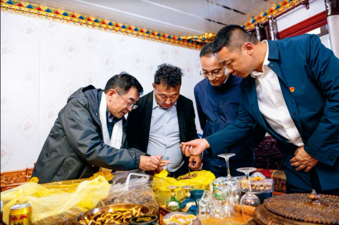 2024年7月26日,连玉明院长在曲麻莱县约改镇入户走访,格前村村民更松罗周展示自己收购的当季虫草。