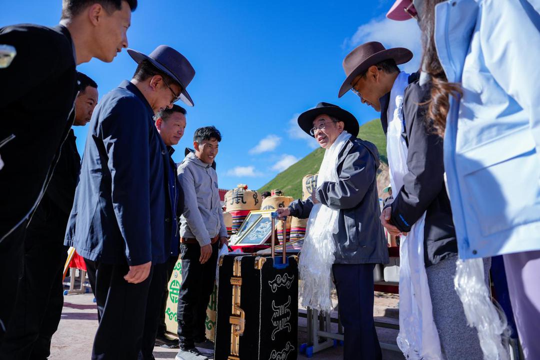 2024年8月9日,在海拔4600多米的黄河源头第一村,玉树藏族自治州曲麻莱县麻多乡党委书记万铁练、麻多乡人民政府乡长罗松江措向连玉明院长颁发郭洋村荣誉牧民证书。