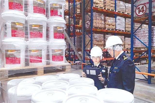 海关关员对出口调味品进行监管。